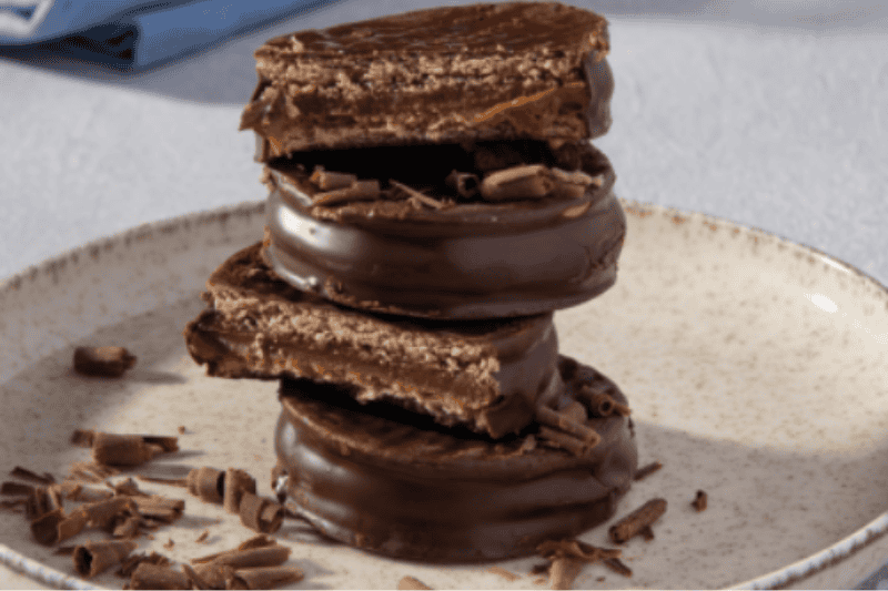 2. Derreta Linea Chocolate Culinário ao Leite em banho-maria e banhe cada alfajor com o auxílio de um garfo.