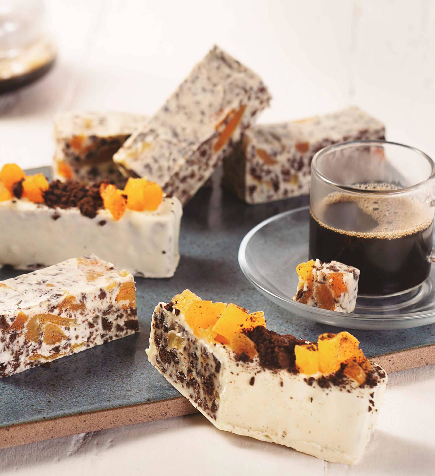 2- Corte em cubos ou barras e passe na pasta derretida. Finalize com o Topping Negresco e damasco picado.