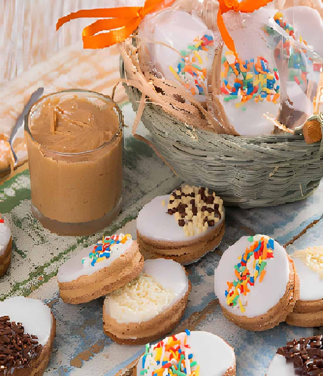 4. Para incluir os confeitos, faça uma camada fina de glaçagem e pressione os confeitos sobre ela. Faça o processo em metade dos biscoitos.
