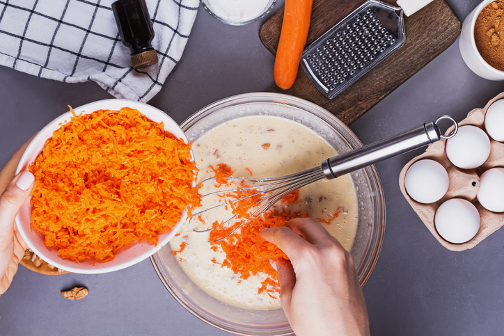 Making carrot cake process, top view. Woman's hands adding grated carrot into a bowl with other ingredients