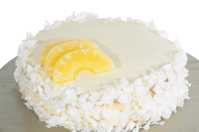 5. Retire e cubra as laterais com as fitas de coco e decore a superfície com meia fatia de abacaxi em calda.