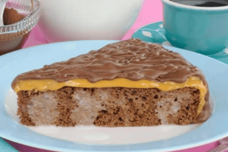 3. Cubra o bolo com o chocolate, leve à geladeira por 5 minutos e sirva em seguida.