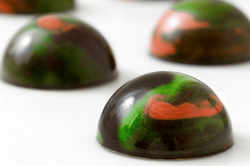 2. Derreter a manteiga de cacau, acrescentar o corante verde e decorar a forma do bombom.
