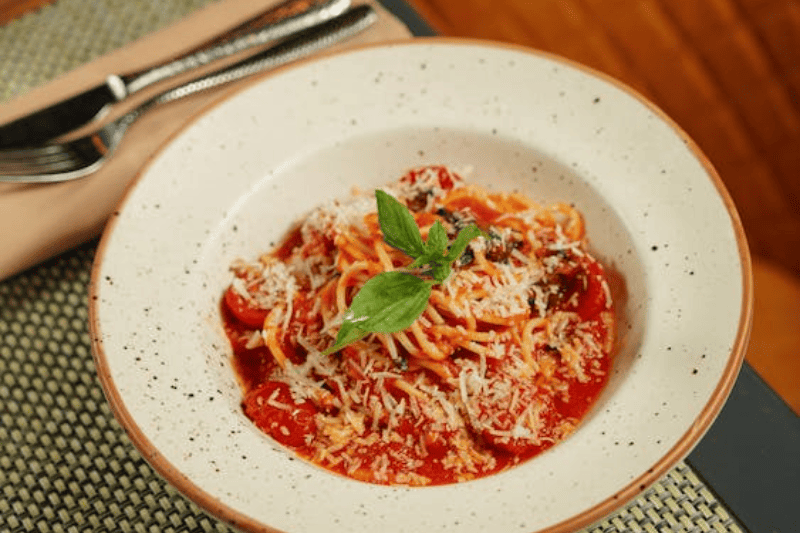 3- Adicionar os tomates cortados ao meio, e as folhas de manjericão rasgadas. Cozinhar por 5 minutos.