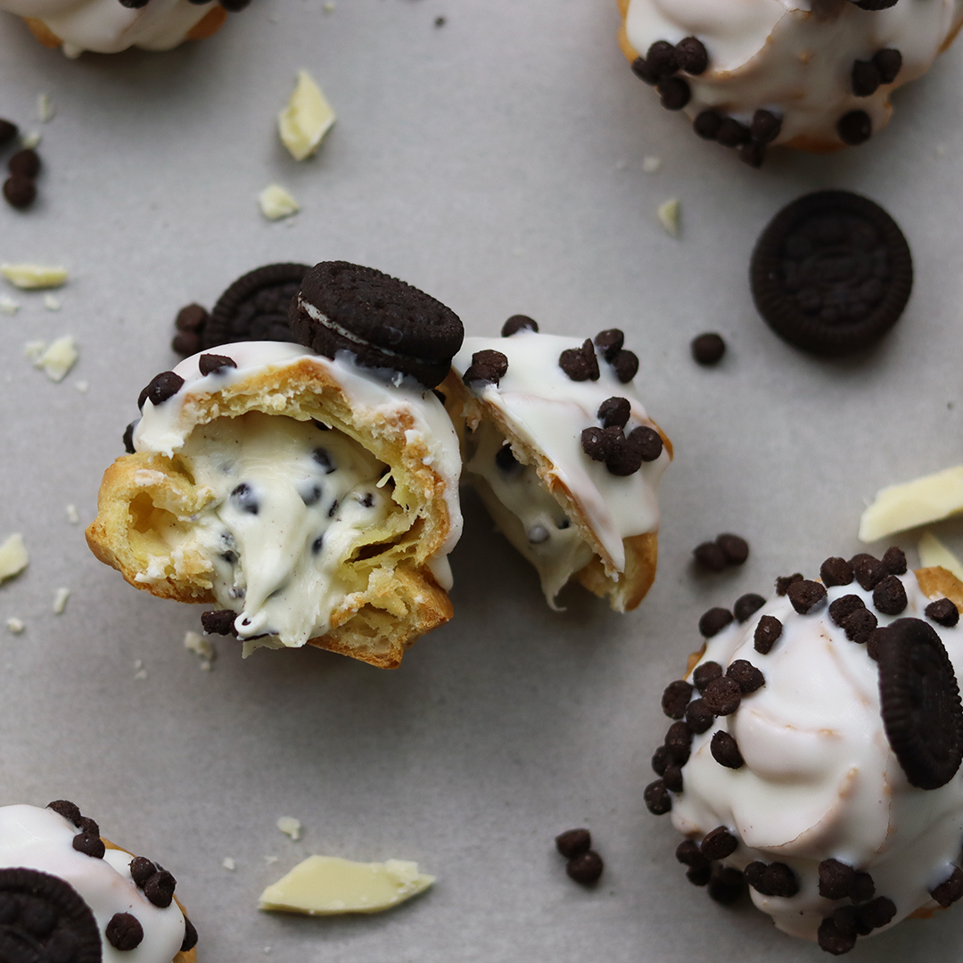 1- Derreta o chocolate branco e reserve, coloque o Recheio de Laka e Oreo Lacta dentro do saco de confeitar e recheie as carolinas furando a parte inferior.