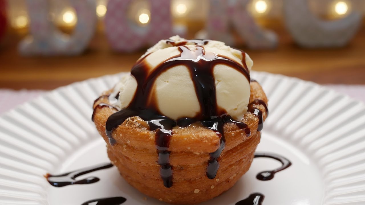 4- Para a Montagem: Frite em óleo quente (180ºC) e depois, passe no açúcar com canela. Coloque doce de leite dentro e depois o sorvete.