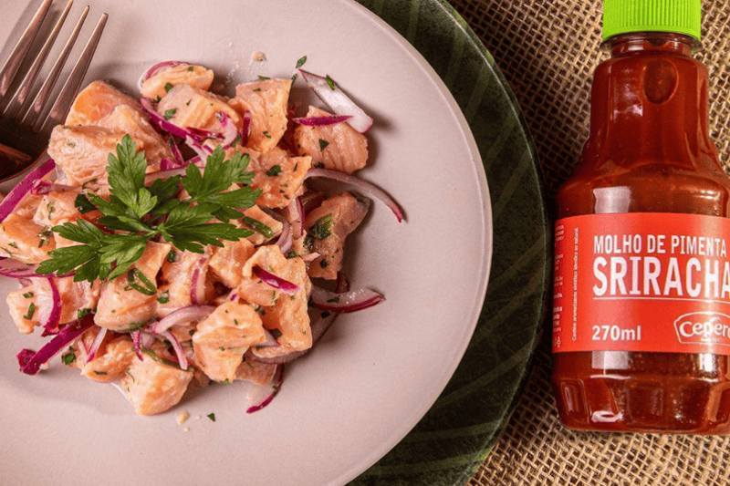 1. Em uma tigela misture o salmão, acrescente o molho de pimenta e o suco de limão.