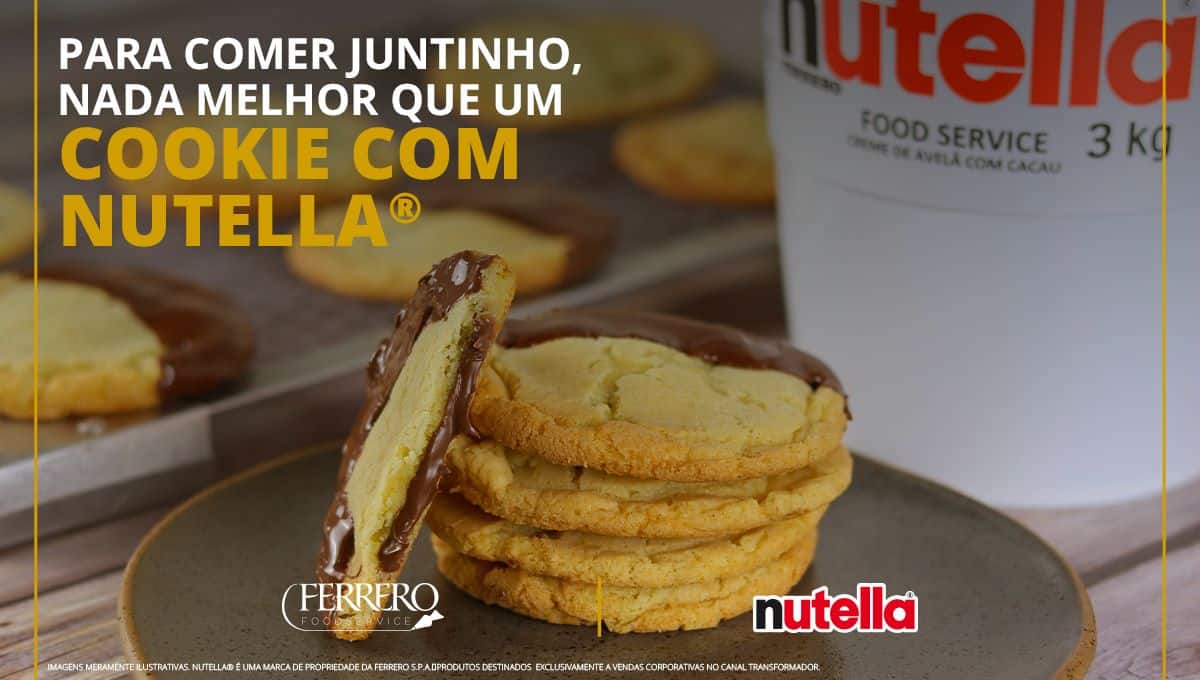 Com o auxílio de boleador de 50ml, porcione toda a massa. Na palma da mão, abra umas das massas boleadas, até que fique com cerca de 0,5cm de espessura. Adicione uma moeda de NUTELLA® congelada, feche o cookie. Molde com a mão, para que o recheio não fique exposto. Leve ao Freezer por 2 horas.
