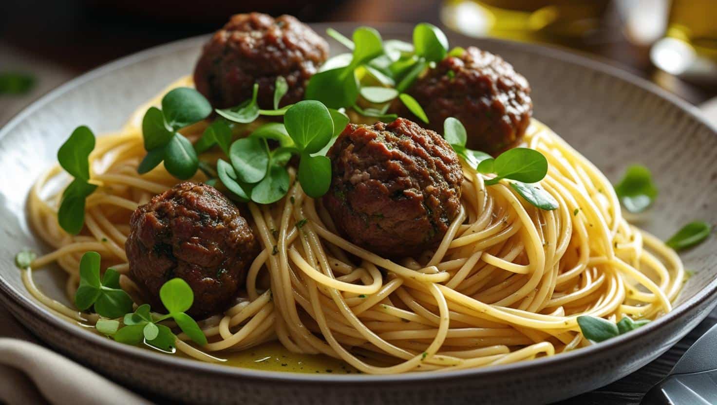 1. Colocar o espaguete no prato. Cobrir com molho de rabada com agrião.