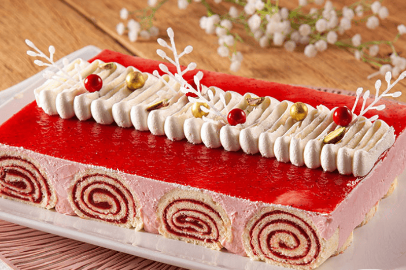 7. Para a montagem, utilize um aro untado 30×17, coloque os rocamboles em paralelo e preencha com a mousse, alise bem e refrigere por 1 hora.