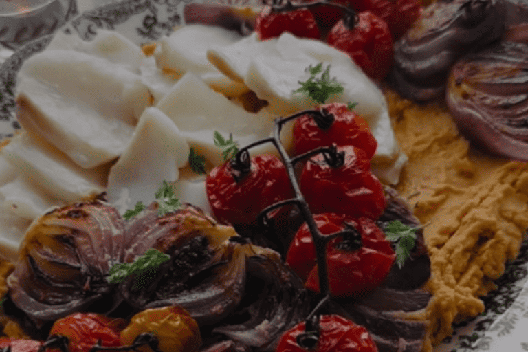 10. Arrume as cebolas assadas, as lascas de bacalhau, e os tomatinhos em rama.