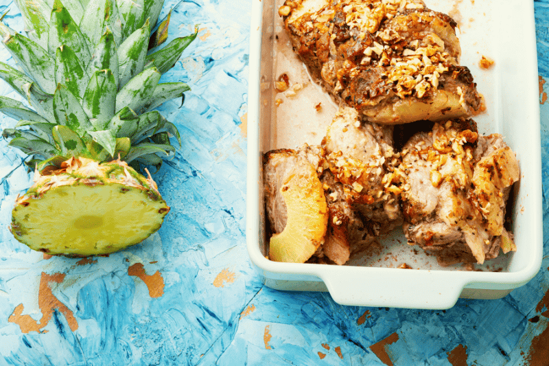 3- Corte em fatias o lombo e derrame por cima o doce de fruta de abacaxi (opcional).
