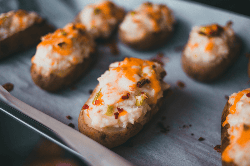 6- Recheie as batatas com um pouco da mistura com cream cheese e coloque a carne moída por cima, polvilhando o queijo mussarela.