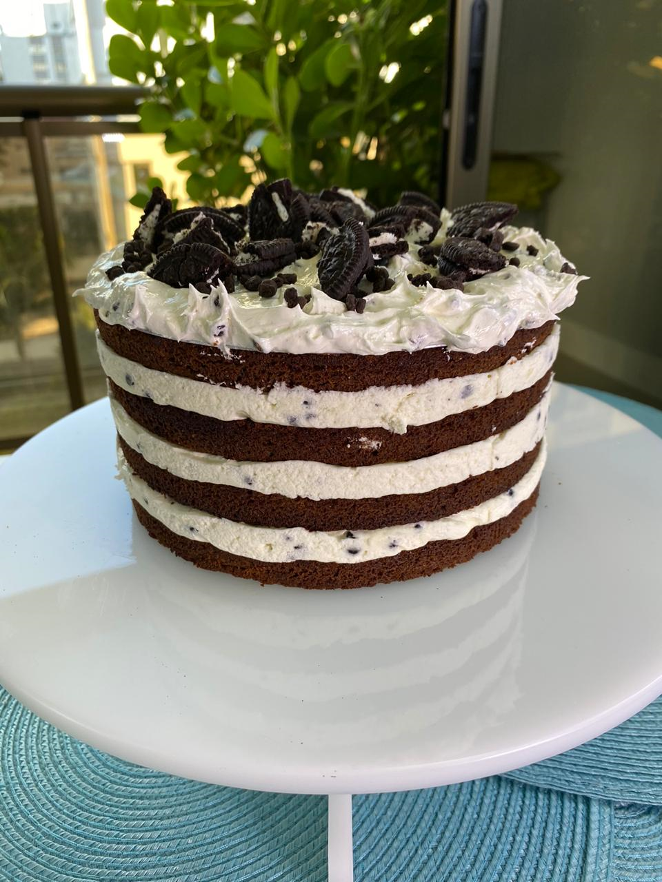 10- Cubra com o chantilly e espalhe com o auxilio de uma espátula, levantando alguns pequenos picos. Adicione os biscoitos quebrados e as gotas de oreo. Antes de servir, retire o acetato.