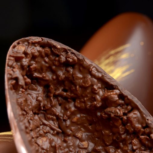 9. Enquanto isso, derreta e tempere o Unique 35%. Misture-o ao crocante já frio e distribua-o dentro das cavidades dos moldes.