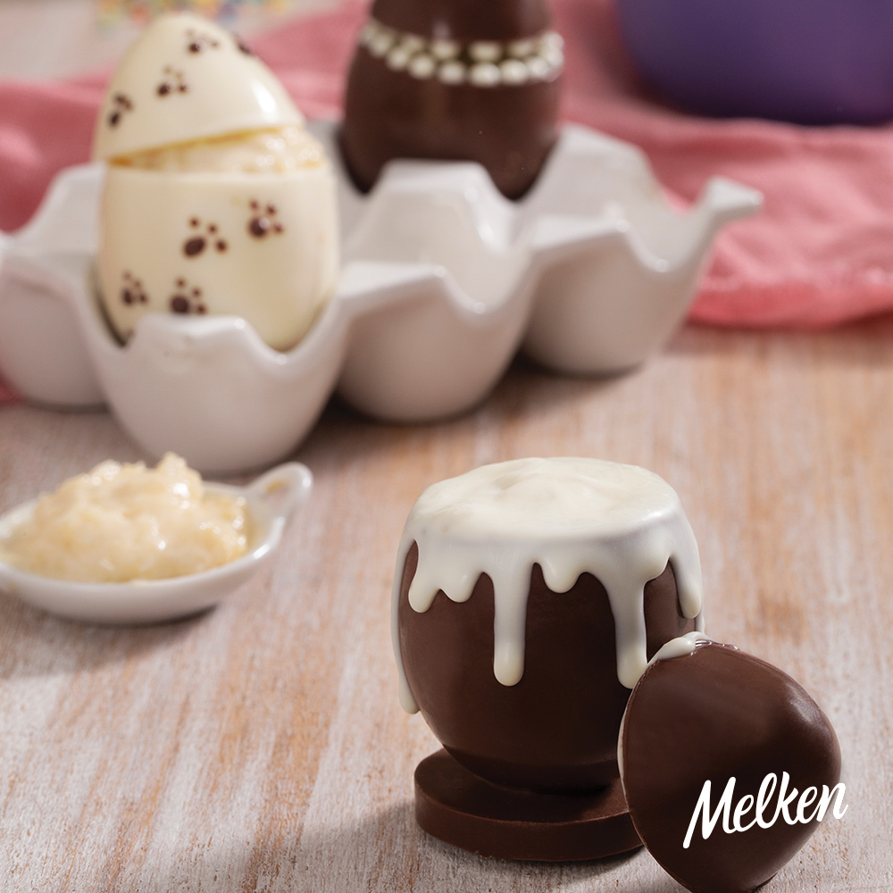 1. Preencha um molde de ovos de 50g com o Cobertura Fracionada sabor Chocolate Meio Amargo Top derretido.