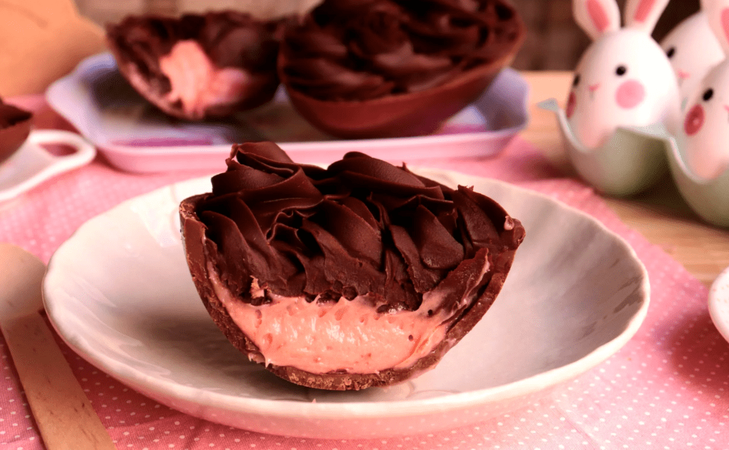 4. Recheie o ovo com uma camada fina e uniforme de mousse e cubra com mais uma camada de Cobertura sabor chocolate Meio Amargo.