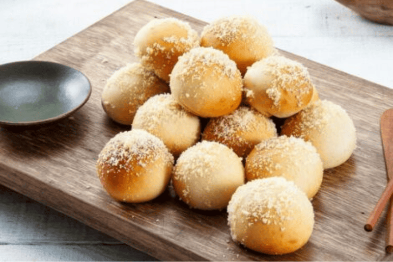 7. Retire do forno, passe a manteiga derretida e enrole no queijo parmesão.