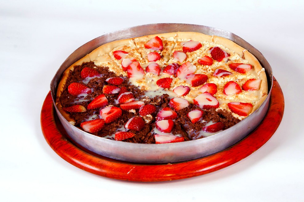 2. Leve ao forno até derreter, retire do forno e coloque os morangos em pedaços pequenos.