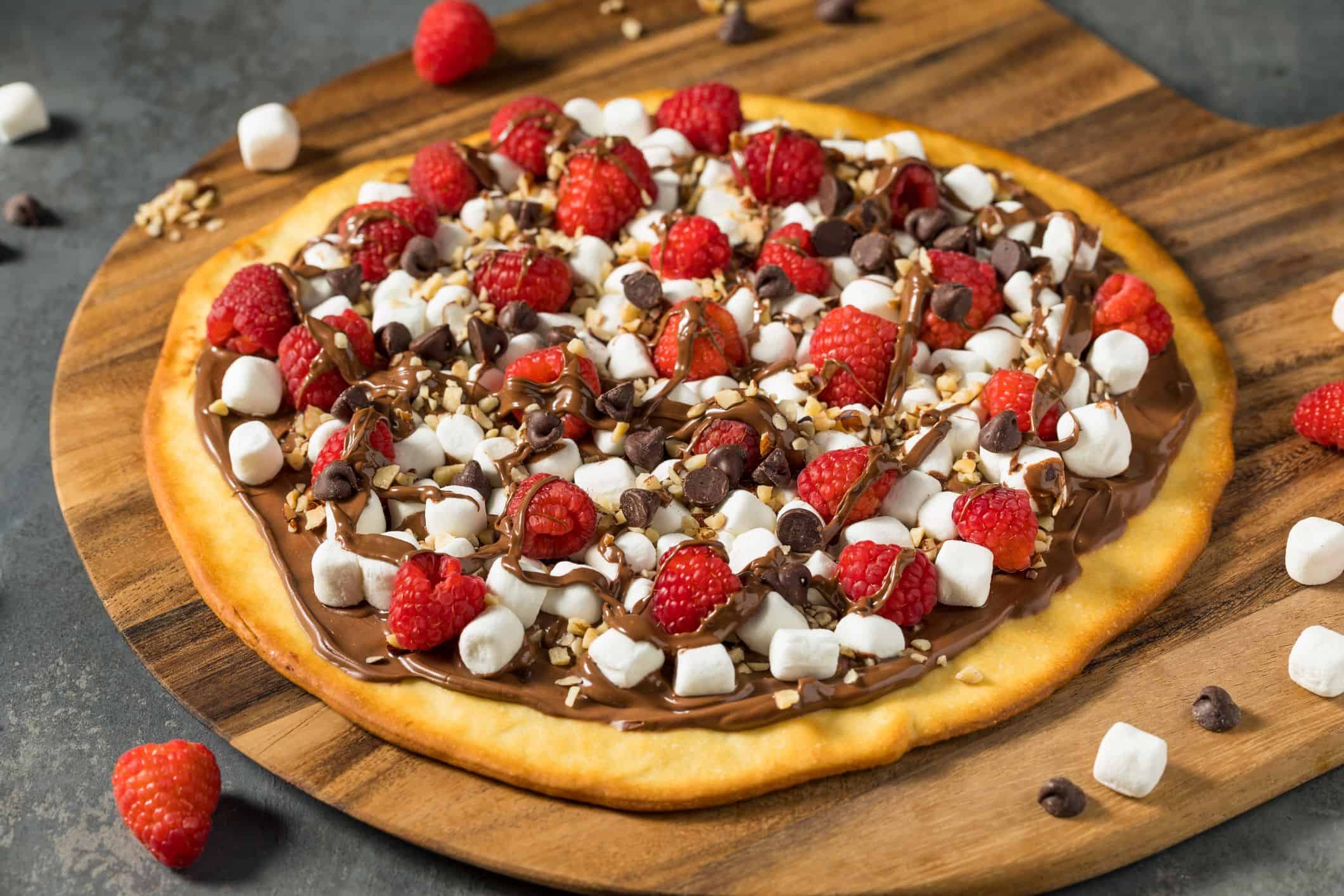 Com o recheio pronto, basta espalhá-lo sobre a massa pré-assada da pizza e levar ao forno por alguns minutos, apenas para aquecer e derreter o chocolate. Depois, decore com as coberturas de sua preferência!