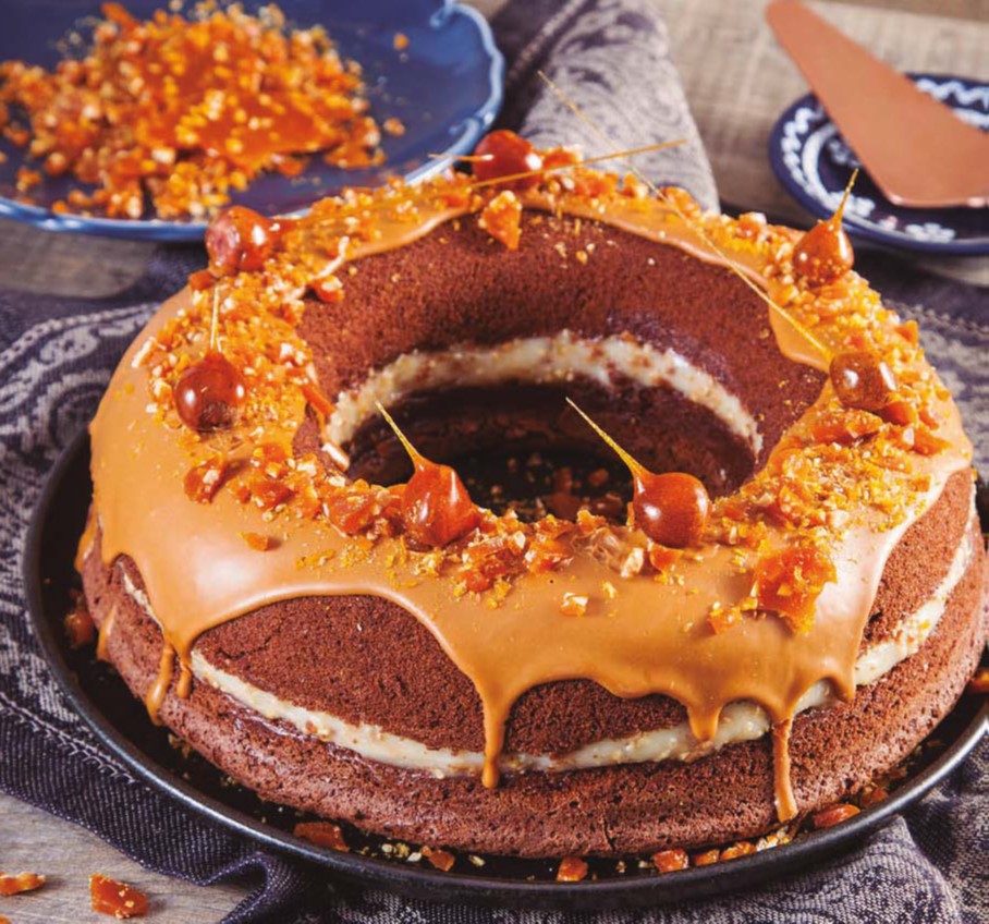 3. Derreta o Ganache Sabor Toffee Rich’s e aplique sobre o bolo. Em seguida, aplique o praliné de avelã.