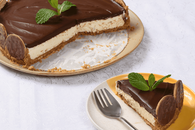3- Montagem da torta: coloque o biscoito triturado com a manteiga embaixo (forrando o fundo), e adicione o creme delicadamente para que os biscoitos não subam, coloque a cobertura e enfeite com biscoito carinho Barion.